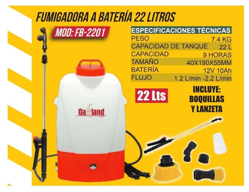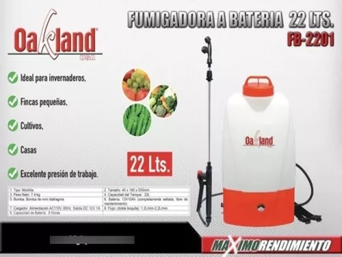Fumigadora a batería FB-2201 con capacidad de 22 Litros. Apta para el hogar, césped y jardín. Maneja de manera fácil los desinfectantes líquidos, fer??lizantes, herbicidas, pes??cidas, etc. Trabajo de 9 Hrs con una barería de 12 V/ 10 Ah. Para invernaderos, fincas pequeñas, cultivos y casas.