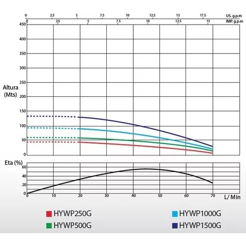 La Bomba Sumergible HYUNDAI HYWP500G es ideal para pozos agrícolas profundos de 4" pulg. de diámetro, sistemas de riego, pozos artesanales uso domestico, etc.