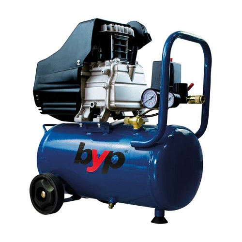 Compresor de aire, con tanque para almacenar hasta 24 litros. Cuenta con válvula de drenado, conexión rápida, filtro, dos salidas de aire (una regulada y otra directa). Dos manómetros para tener un mayor control sobre el equipo. Manual de instrucciones.