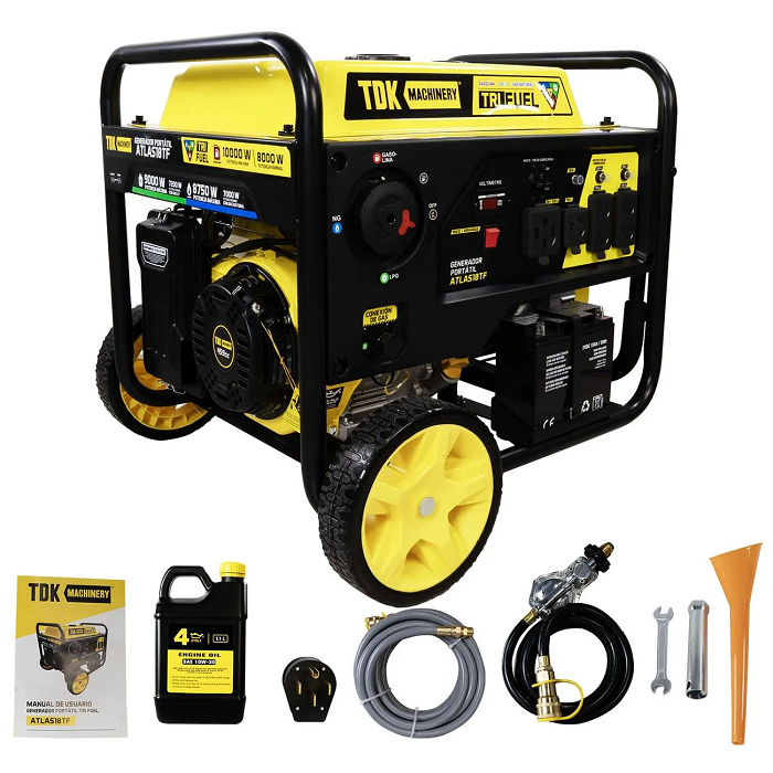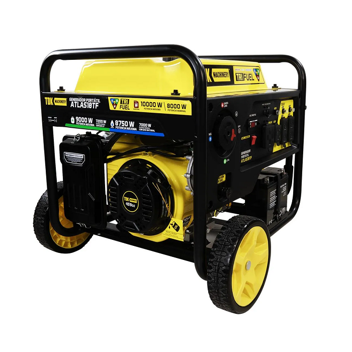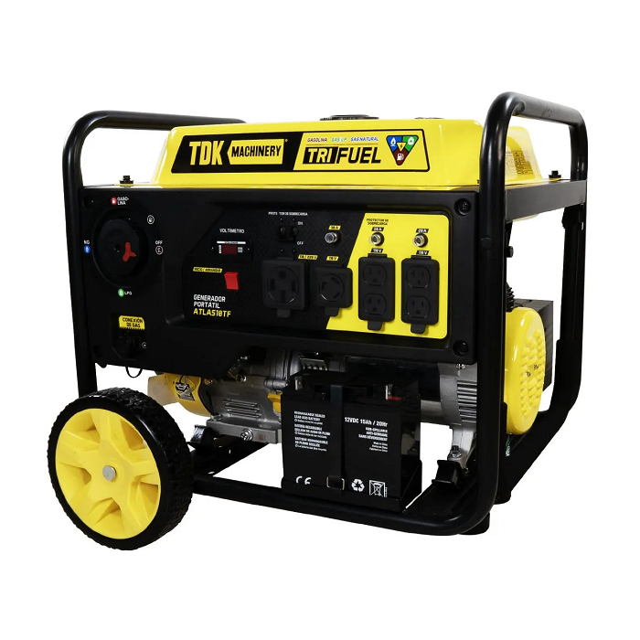 NUEVO Generador Profesional Portátil TRI FUEL con arranque de 3 tipos de combustible: Gasolina, Gas LP y Gas Natural y motor de 4 tiempos marca TDK MACHINERY. Sistema de alerta de bajo nivel de aceite. Alternador con devanados de cobre. Selector de voltaje 110v/220v. Protector de sobrecarga. Conexiones rápidas para Gas LP/Gas Natural ubicados en el panel (se incluyen conexiones y mangueras). Display digital que muestra el voltaje, frecuencia, carga y horómetro. Tomas de corriente con GFCI de protección.