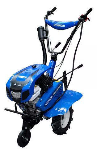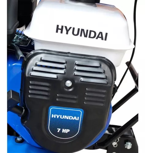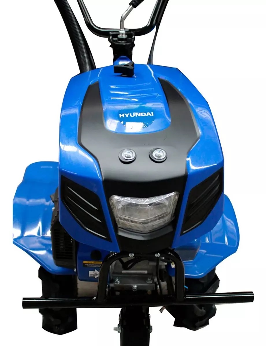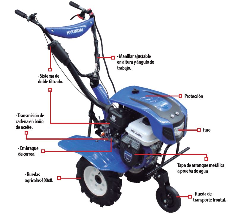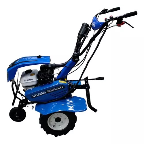 Motocultor Profesional Hyundai 7 Hp 3 Velocidades - RAM750PLUS. Este modelo de motoazada de la marca HYUNDAI cuenta con un motor a gasolina de 7 hp. Viene equipada con una cubierta protectora y una lámpara led. Posee 2 velocidades y una reversa. Su transmisión es a través de cadena y banda. Las ruedas agrícolas son de 400 x 8. Cuenta con un sistema de doble filtrado. El manillar es ajustable en altura y ángulo de trabajo. La transmisión de cadena se realiza en balo de aceite. La tapa de arranque es metálica y resistente al agua. Incluye una rueda de transporte frontal.
