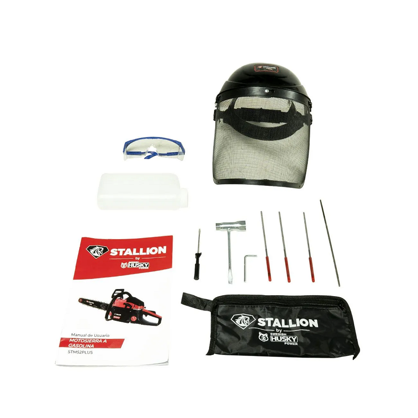 Incluye 2 cadenas, 2 barras, gafas de seguridad, careta con malla, kit de herramientas, 3 botes de 100ml de aceite mineral, protección auditiva, juego de 3 limas, 2 tuercas extra para barras, 1 bujía extra, recipiente de mezcla, 1 filtro de combustible. Ideales para poda y derrame de árboles, jardines y finca.